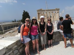 After a slow and painful process, the 4 of us did manage to make it to the airport, with the weight of our small children in tow! Relieved to be on the plane, we were entertained by the film ‘Valentine’s Day’, if only because Ashton Kutcher graced the screen with his physique every few minutes! We landed in a very humid Athens, to brilliant sunshine, with the heat of the day shimmering over the tarmac of the airport. After what seemed like the longest, hottest bus journey in the world, and after passing several hundred McDonalds, Starbucks and Burger Kings (Athens has not escaped commercialisation), we arrived in the tourist centre of Athens, at Syntagma Square. Next stage- finding the youth hostel- simple right? Wrong! After checking at tourist information, and being harassed by street vendors, we finally managed to get on another bus to take us to the area in which our hostel was situated. Unfortunately, all small streets in Athens seem to merge into one massive giant maze, so we ended up wandering for about 20 minutes in the wrong direction. All of us now hot, tired, sweaty and grumpy, we eventually located the Pagration Youth Hostel- with no sign posts to anything to indicate its position on the map!