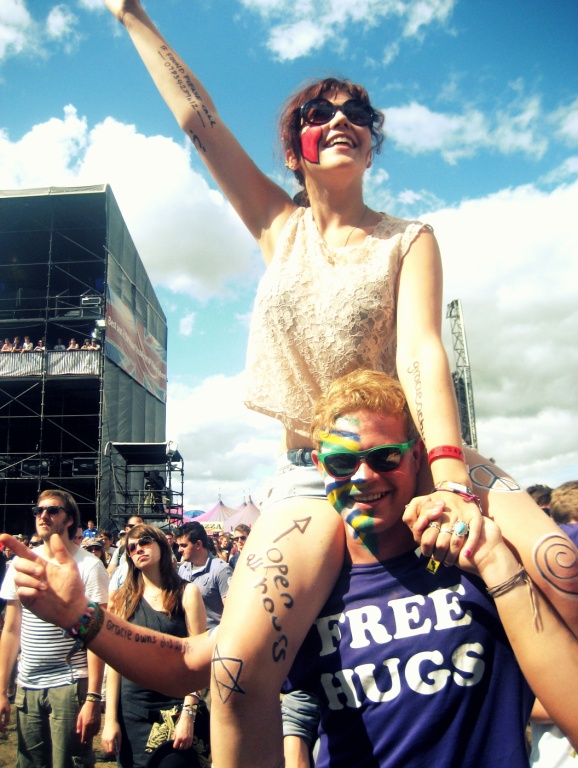 The next five days are more of a haze than a blur. The sun shines almost constantly, and when it rains it pours – but doesn’t dampen the spirit (much). My friends are screaming at me “Grace, you’re at a festival!” whenever I complain about the state of my hair or lack of makeup. I’m searching every crowd frantically for a glimpse of friends from home or my ex-boyfriend. I desperately want to be on the Big Screen at the Main Stage. My friends and I loot an abandoned tent nearby to find a loaf of bread, several packets of Snack A Jacks and custard creams, and we shout “guys, we’ve struck gold!” upon finding a sealed jar of Nutella. We get drunk at noon. I’m so used to the smell of weed that coming across a pocket of fresh air is both alien and unexpected. We ran to the arena in the rain to catch Green Day’s secret gig; I stared up at Billy Joe and was suddenly fifteen again. We tried to light a campfire consisting of damp cardboard and Fosters cans. I cried in the arms of my best friend for most of the second night, then was laughing again the next morning. Every single person who walks past while we’re mid-conversation gets pointed at and told “this guy knows what I’m talking about!” We spent one afternoon scribbling all over one another’s exposed skin with face paint pens and Sharpie. People are constantly coming to our campsite asking if we’re selling drugs, or offering us some; “Noss”/laughing gas is wildly popular, we even meet a guy who has 90 canisters in his tent and is giving out freebies. We grab a cheeky five minutes inhaling oxygen for £5 at the Oxygen Bar, to keep our energy up for the Foo Fighters gig. Our crazy drunk friend wears a FREE HUGS shirt and thus it takes us forever to get through the crowds. My bestie and I fall asleep at 9pm, wake up at 11pm and go to the Silent Arena. My moods change on an hourly basis and I’m not sure why; is it the antibiotics, the drinking, the lack of sleep, my friends, the crowds, the music, being away from home? Who knows. I’m terrified of being up on someone’s shoulders, but I love the feeling. Talking to random people and finding they’re all lovely and friendly (and just as chatty as me) is the nicest and most shocking thing about this festival business. Feeling close to people I’ve only just met, and even closer to my existing friends, is the best. The toilets are disgusting and as the week progresses I can smell them from across the campsite; I’m not comfortable talking about toilets or bodily functions so I sit and cringe quietly while all my friends do. Everyone is giving up smoking after this weekend. The girl two tents over needs a smack and a reality check – she also needs to stop stealing my friends. I accidentally stole a bottle of Archers from Sainsbury’s. I desperately need a shower. Florence Welch is like a real-life fairy, Dave Grohl is insane and Tom Delonge calls himself Thomas. The expression “bantabantabanta” is not going to become a thing. All girls on site seem to be perfectly comfortable showing half their arses all day long; the drinking game Slut Shorts is guaranteed to get you bladdered. We said hi to Fearne Cotton and Greg James. I had a shower in Sunningdale. We quote Drake & Josh. I was amazed at how incredible the music was, and how much I enjoyed it, given that the main reason I’d come to Fest was for the social antics and the atmosphere.
