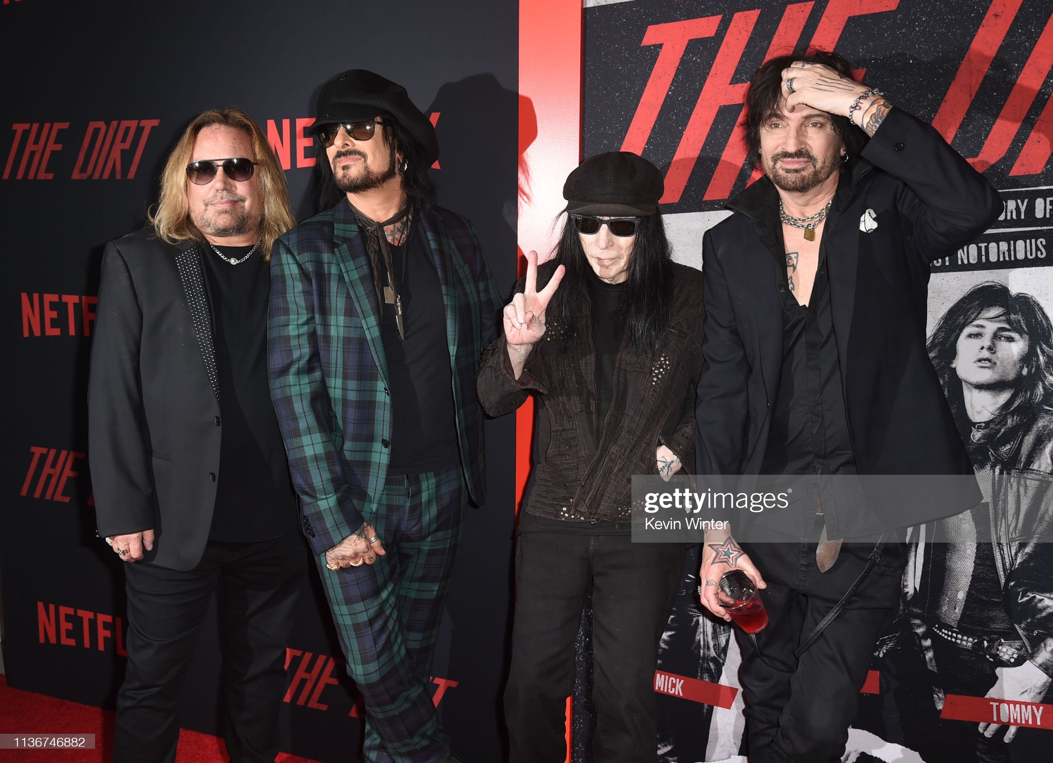 (L-R) Vince Neil, Nikki Sixx, Mick Mars and Tommy Lee of Mötley Crüe arrive at the premiere of The Dirt at ArcLight Hollywood on March 18, 2019 in Hollywood, California. (Photo by Kevin Winter/Getty Images)