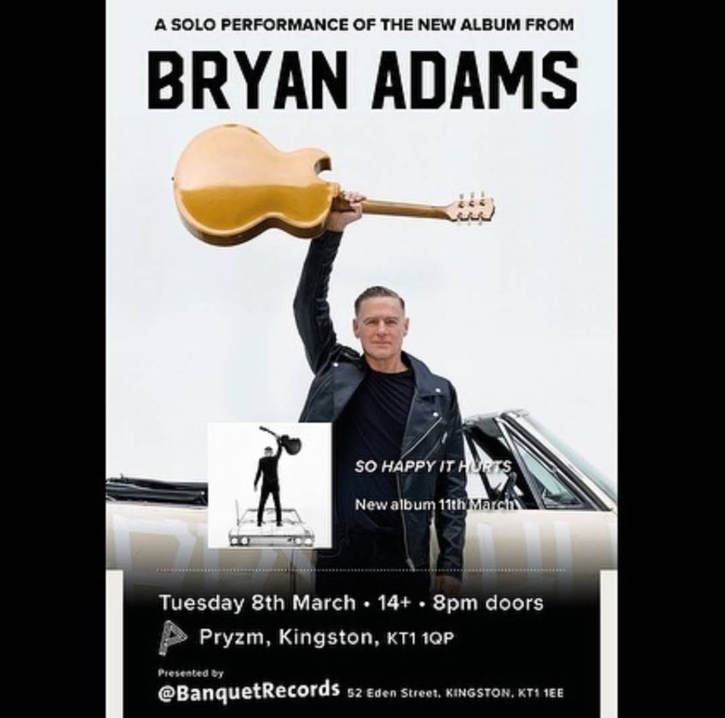 Two nights ago, I got the chance to venture out into the world. My destination? The PRYZM nightclub in Kingston. The reason? One of two exclusive performances Bryan Adams was giving that day, in promotion of his new album, So Happy It Hurts, which is to be released tomorrow (March 11th). All made possible by independent record shop, Banquet Records.